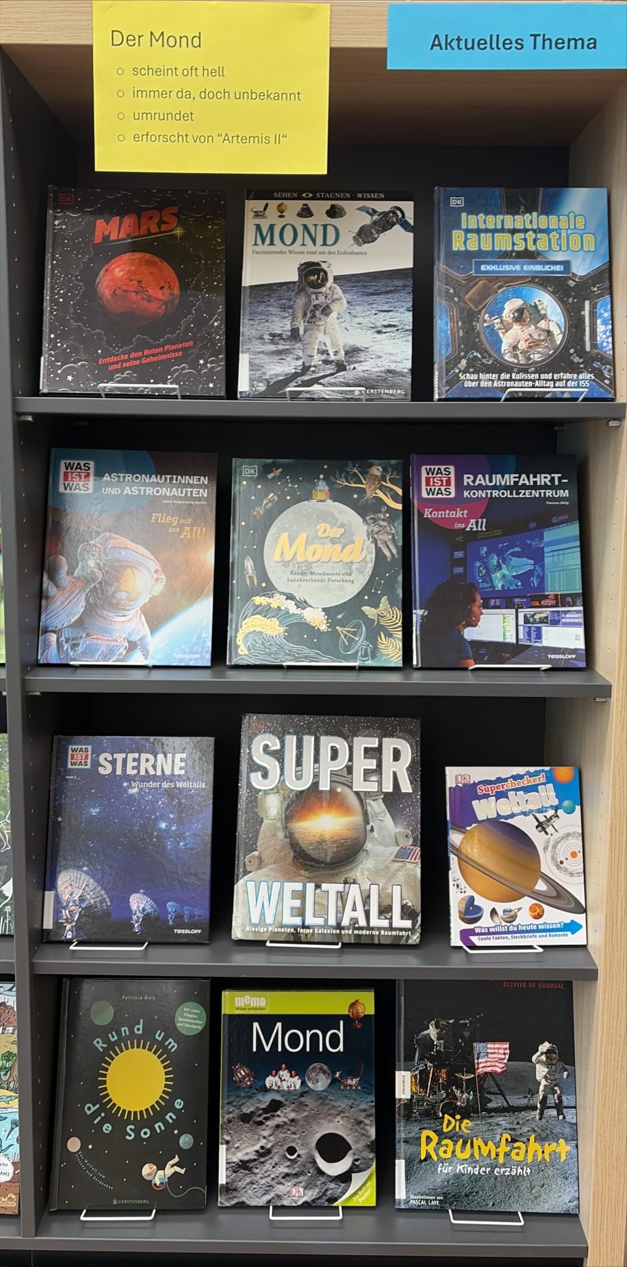 Der Mond ist ein geheimnisvoller Begleiter am Nachthimmel, der jede Nacht anders aussieht – mal ganz rund, mal nur wie eine schmale Sichel. Viele spannende Geschichten und Entdeckungen drehen sich um den Mond: Astronauten sind schon dorthin geflogen, und Wissenschaftler erforschen ihn bis heute. Die Schüler:innen finden in den Büchern unserer Bibliothek viele tolle Bilder, Abenteuer und erstaunliche Fakten – der Mond wartet darauf, von ihnen entdeckt zu werden!